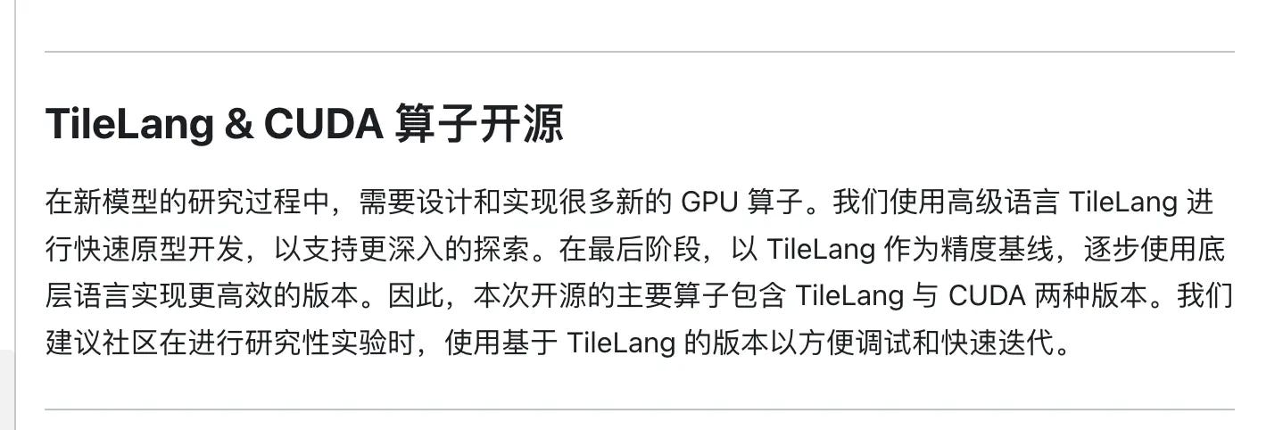 In the process of researching the new model, many new GPU operators need to be designed and implemented. We use the high-level language TileLang for rapid prototyping to support deeper exploration. In the final stage, with TileLang as the accuracy baseline, we gradually implement more efficient versions using low-level languages. Therefore, the main operators released in this open source project include both TileLang and CUDA versions. We recommend that the community use the TileLang-based version for research experiments to facilitate debugging and rapid iteration.